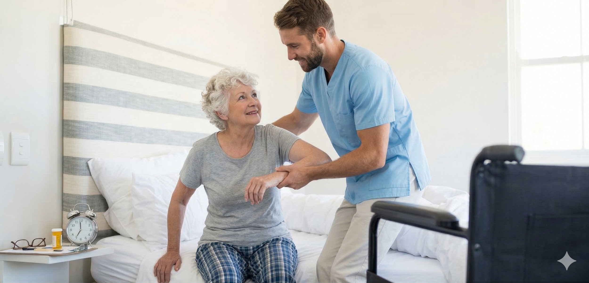 Mobility and transfer assistance (wheelchair, walker, bed transfers)